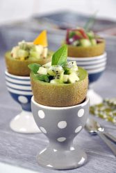 - Couper les kiwis en deux puis les évider à la cuillère en prenant soin de laisser dans la peau un peu de chair. Tailler la chair évidée en petits dés. Les répartir dans 3 bols.