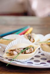 - Farcis chaque pâte de cette préparation. Dépose dans chaque alvéole de la boite d'œuf une caissette en papier pour y placer les pâtes farcies.