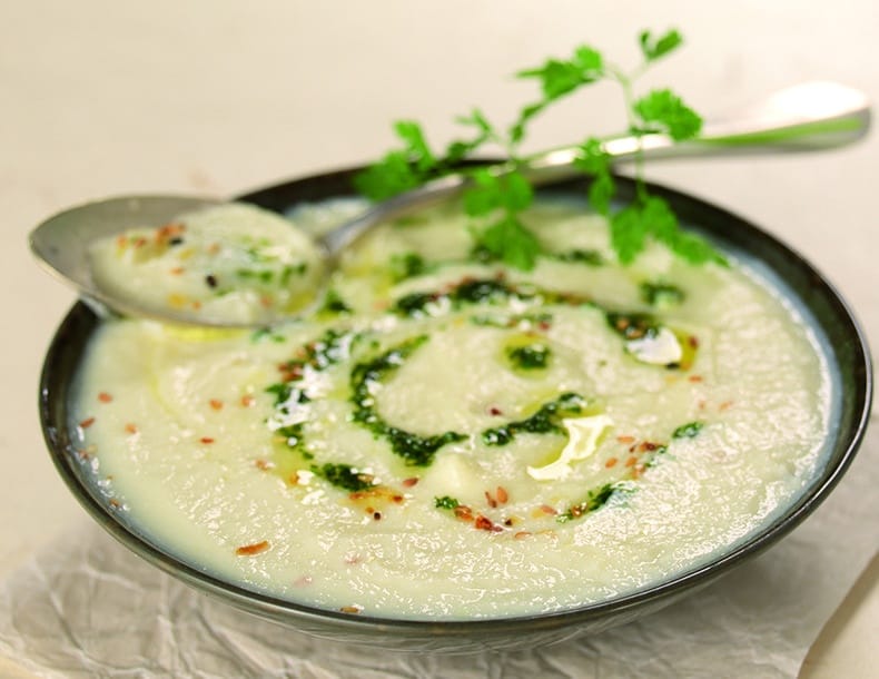 La soupe de pommes de terre, c’est vu et revu. Pourquoi ne pas la remplacer par le chou-fleur ? On connaît des recettes de ce légume version “gratiné” ou à la vapeur. Donnez-lui une nouvelle texture en réalisant un velouté léger, très léger. Un geste suffit : après l’avoir coupé, mixez, mixez, mixez ! Fine et légère, cette soupe va vous tenir au chaud et parfumer votre assiette.