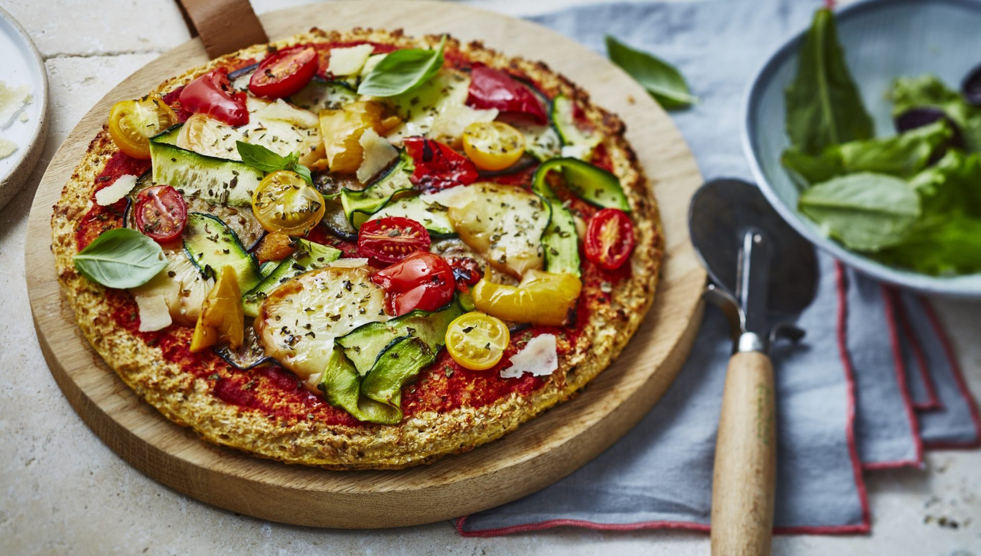 - Juste avant de servir, répartir quelques copeaux de parmesan et quelques feuilles de basilic sur la pizza. Accompagner d’une salade verte agrémentée de roquette.