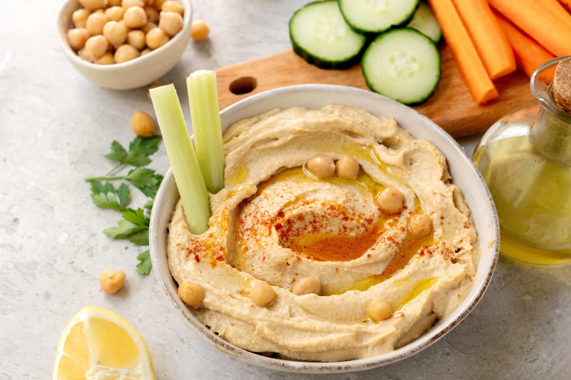 Mixer 400 g de pois chiches cuits, 2 belles poignées de roquette, une gousse d’ail, 2 cuillères à soupe d’huile d’olive, saler et poivrer. Notre recette d’houmous