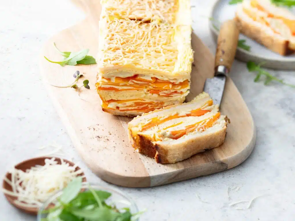 Et si on variait avec un croque-cake ? Des tranches de pain de mie intercalées avec des couches fondantes de légumes d’automne à la muscade… Miam.