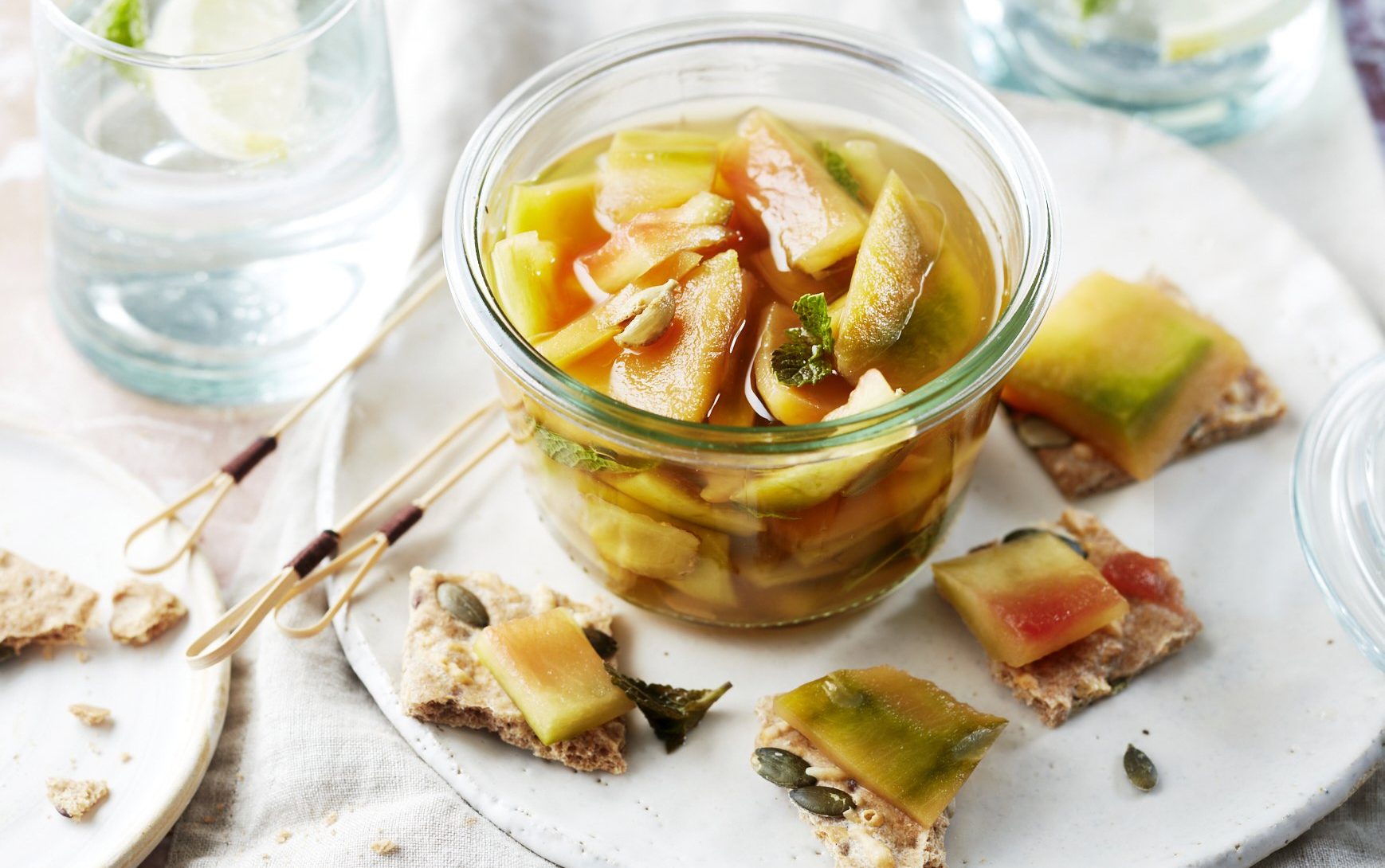 Pickles de peau de melon et pastèque, cardamome, menthe