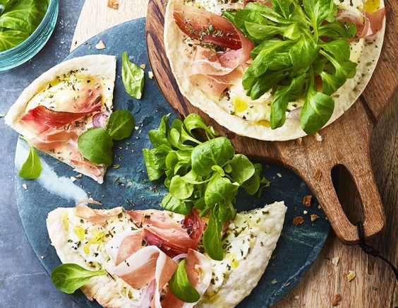 - Formez une boule et laissez-la lever sous un torchon humide pendant une bonne heure. Divisez la pâte en trois pâtons, étalez-les finement en trois pizzas à garnir. Vous pouvez bien sûr acheter des pâtes prêtes à garnir dans le commerce.