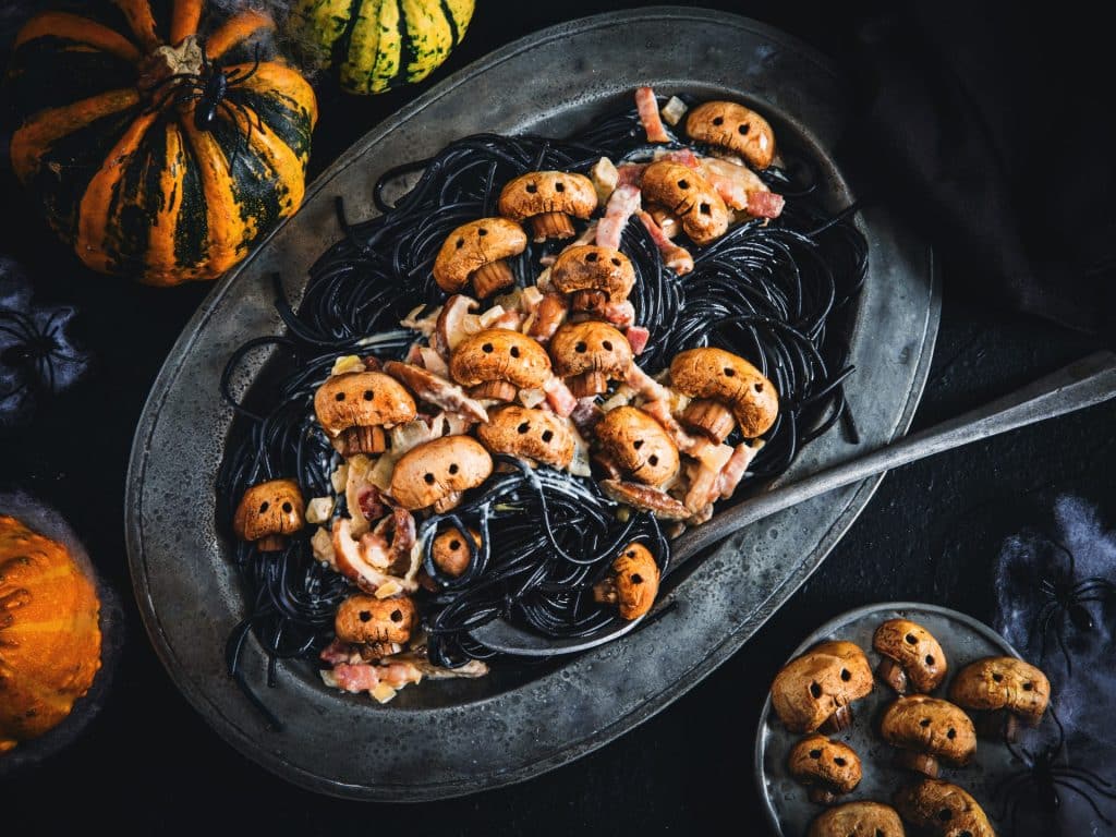 Halloween ça creuse… et pas que les tombes ! Pour caler ton estomac, rien de tel que les pâtes d’Halloween. Sur la base de pâtes crémeuses champignons, ail et fines herbes, mais avec des champignons « crânes » et éventuellement des pâtes noires pour pousser la déco glauque à fond.