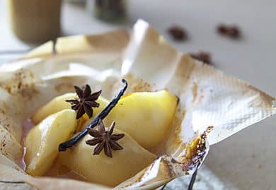 La cuisine en papillote met aussi en émoi les becs sucrés, ainsi que les fruits frais ! Qu’ils se prélassent dans un bain de chocolat et de noix de coco râpée, de miel, d’épices, qu’ils soient parfumés de grains de vanille, ou qu’ils cuisent en solitaire, les fruits adorent en effet séjourner en papillotes. Pomme et poire, nectarines ou abricots y compotent à leur aise et se transforment à l’envi en crumble lorsqu’on y ajoute des biscuits écrasés. Mangue et figue fraîches aiment également « papilloter » avant de s’afficher dans l’assiette en compagnie d’une généreuse boule de glace (vanille, nougat, chocolat noir, noix de coco, etc.).