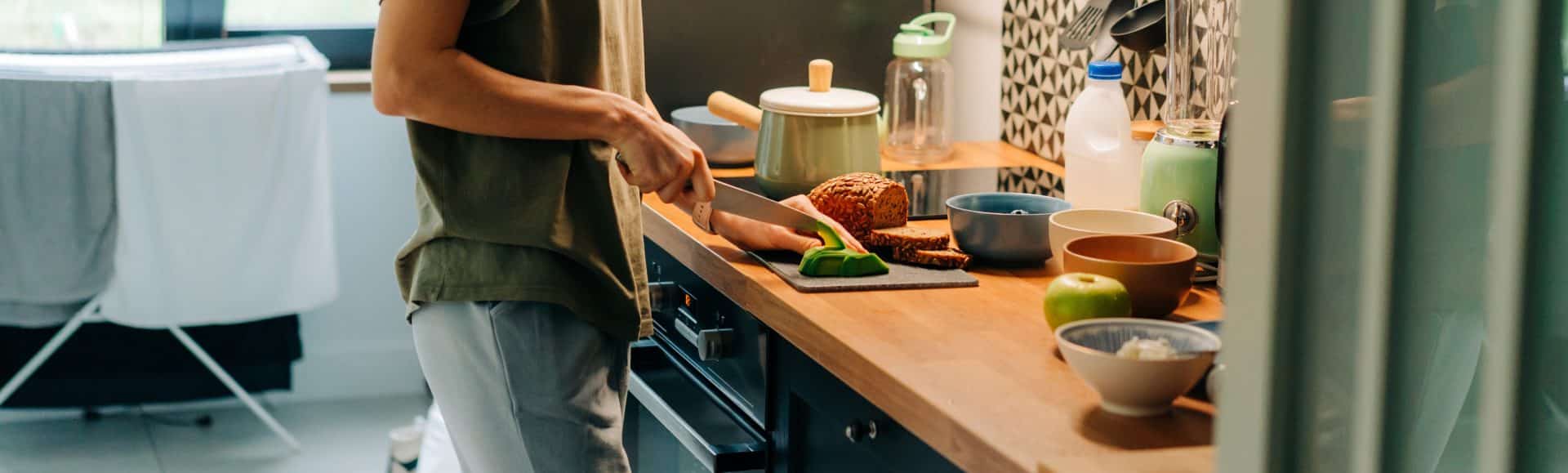 Règle 3 : ayez les ustensiles nécessaires pour cuisiner un minimum et bien. Pas forcément hors de prix mais à avoir : un bon ensemble de différents couteaux, un pèse-aliment, des casseroles de différentes tailles, une poêle antiadhésive (obligatoire !), un minuteur, un verre doseur, un épluche-légumes, une râpe, un fouet et un mélangeur. Liste non exhaustive.