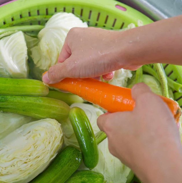 Lorsque vous préparez vos fruits et légumes frais : peler et laver soigneusement vos fruits et légumes à l’eau claire