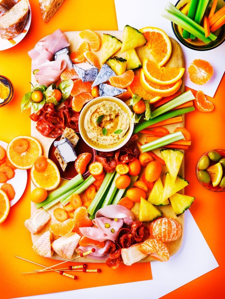 Une planche éclatante, faite de fruits orange et de légumes croquants.