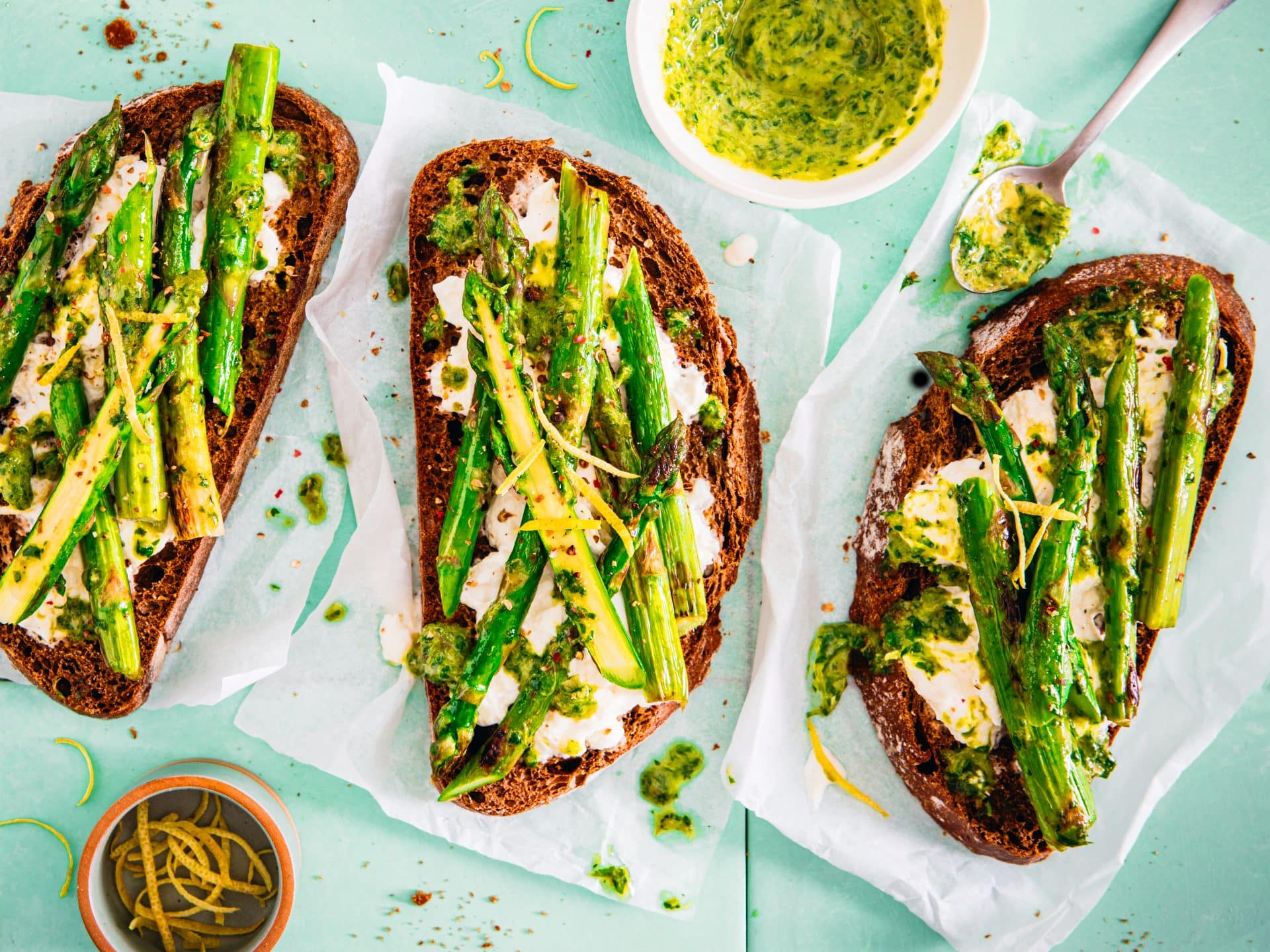 Tout simple. Les asperges sont grillées à la poêle et déposées sur des toasts de pain au levain, avec une préparation à la mozza.
