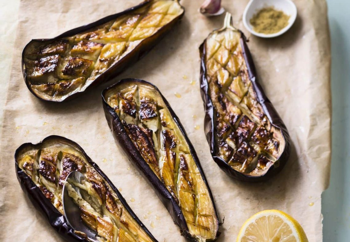 Caviar d’aubergine : aubergine rôtie entière au four, la chair prélevée et parfumée d’ail haché, d’une pointe de sel, assaisonnée d’huile d’olive et épicée d’un peu de cumin.