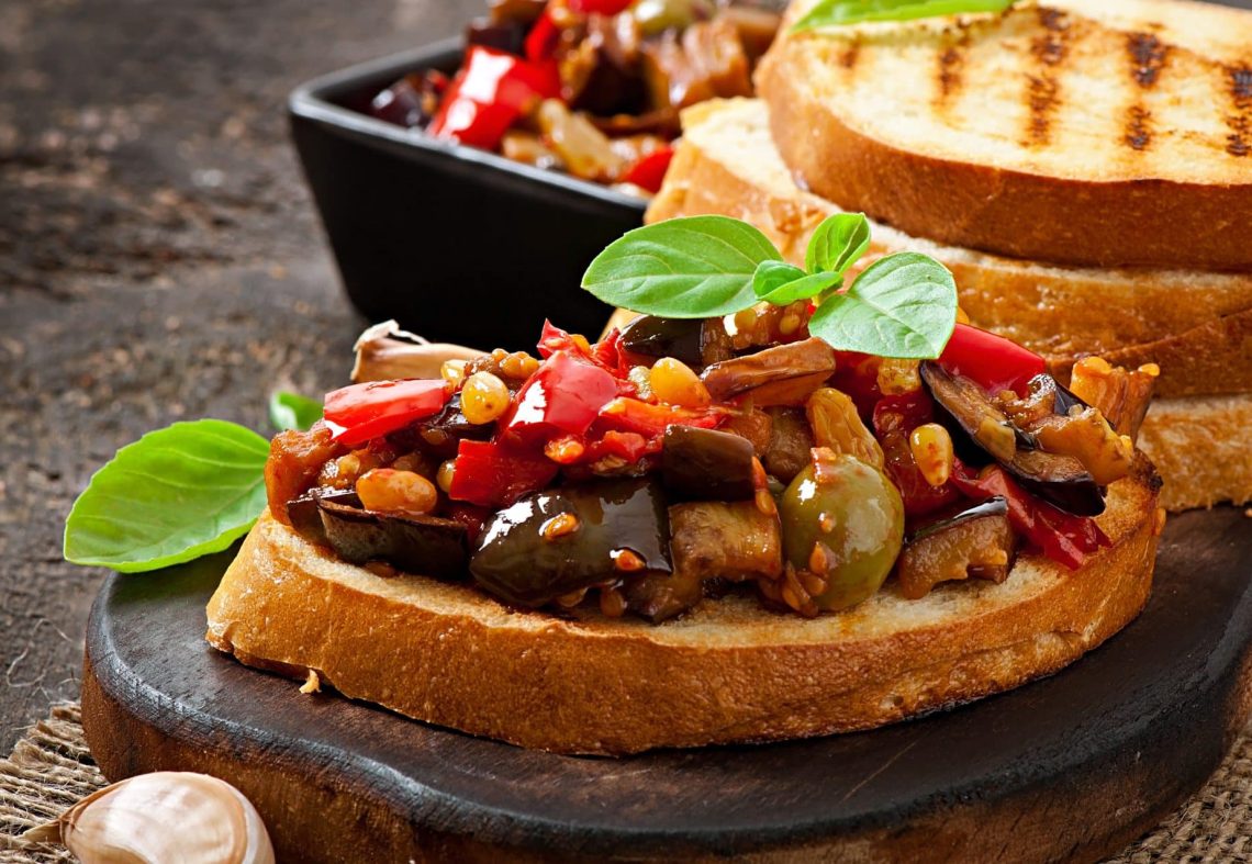 Crostinis : tartines préalablement rôties à la poêle dans un fond d’huile d’olive puis garnies selon le goût de tomates fraîches, de mozzarella, de câpres au sel, etc.