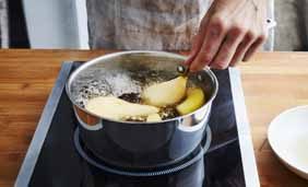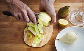 Peler et épépiner les fruits (ils peuvent également être cuits entiers, juste pelés). Les arroser de jus de citron pour leur éviter l’oxydation (on peut aussi simplement frotter la chair du fruit avec un demi-citron).