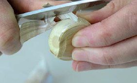 4. Ouvrez la gousse en deux dans la longueur et retirez, si besoin, le germe avec la pointe d’un couteau. Selon le goût et l’envie, hachez au hachoir électrique, au presse-ail, écrasez juste la gousse avec le plat d’une lame de couteau, ciselez au couteau d’office…