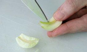 3. Pour éplucher les gousses, coupez d’abord le talon puis retirez la peau à l’aide d’un couteau d’office.