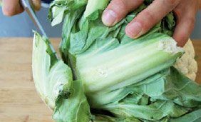 Ôtez les feuilles vertes et la base du trognon principal à l’aide d’un grand couteau pour dégager entièrement l’inflorescence.