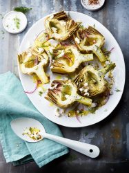 - Disposer les demi-artichauts sur une grande feuille de papier cuisson, parsemer de sel, de poivre et arroser de 2 c à s d’huile d’olive. Refermer le papier cuisson en papillote et mettre à cuire au four préchauffé à 180 °C pendant 35 min.