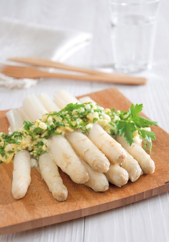- Couper au besoin la base filandreuse des asperges. Les rincer sous un filet d’eau. Les botteler en 4 bottes d’égale grosseur, avec du fil de cuisine.