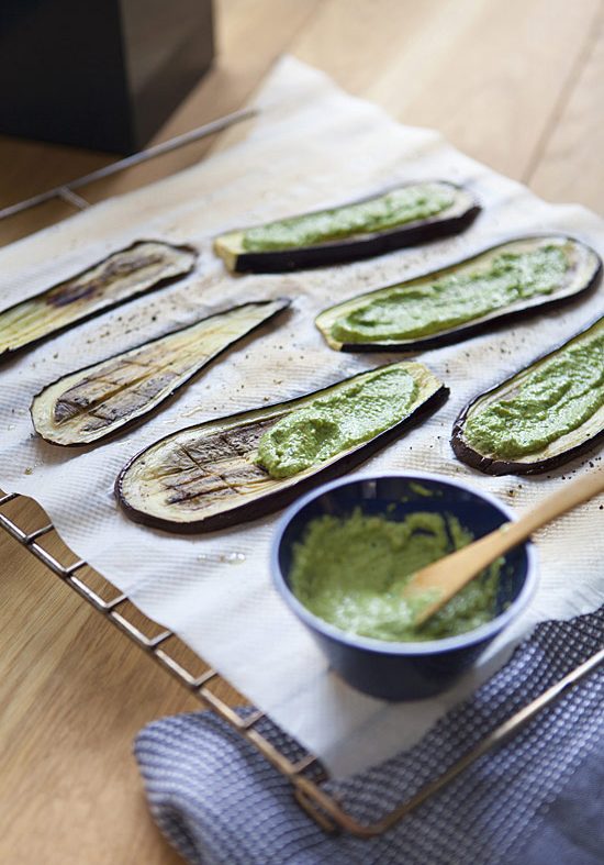 4. A la sortie du four, tartiner les aubergines de cette préparation et servir sans attendre.