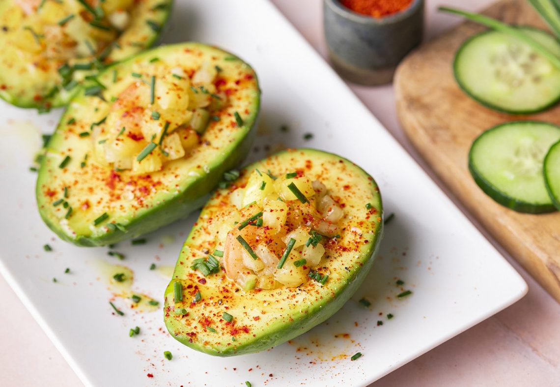 - Garnir chaque demi avocat de ce mélange. Parsemer de fleur de sel, de piment d’Espelette et arroser d’un filet d’huile d’olive.