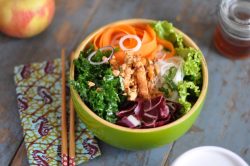 - Dans deux bols à couvercle (mini-saladier de pique-nique avec couvercle ou grand bocal), déposer la salade puis les nouilles de riz. Répartir ensuite harmonieusement les légumes taillés, le poulet puis parsemer de menthe ciselée et de cacahuètes écrasées.