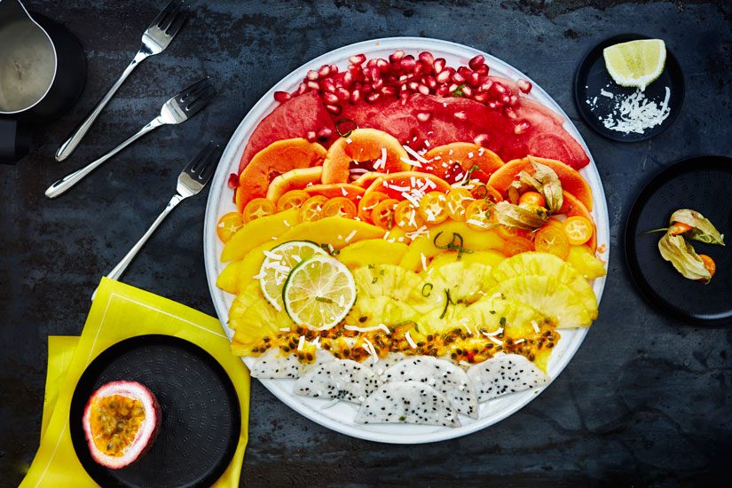 Répartir les tranches fruits sur l’assiette en les plaçant par couleur, à la manière d’un arc-en-ciel.