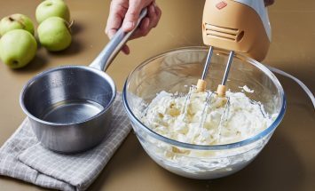 - Dans un grand saladier, fouetter le fromage frais à l’aide d’un batteur électrique. Verser le sirop petit à petit jusqu’à ce que le mélange soit homogène.