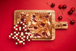 - Dans un bol, battre le cream cheese avec les 50g de sucre restant jusqu’à obtenir une texture lisse. Déposer des cuillères de ce mélange sur la préparation au chocolat et mélanger avec la pointe d’un couteau de manière à créer l’effet marbré. Répartir les cerises sur le marbré.