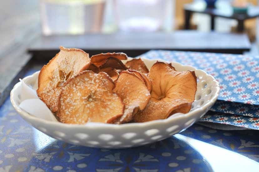- A la sortie du four, laisser sécher et refroidir les chips de pomme.En option, saupoudrer les chips d'un léger voile de sucre glace avant de servir à l'apéritif ou en guise de biscuit pour accompagner une compote, une glace, etc.