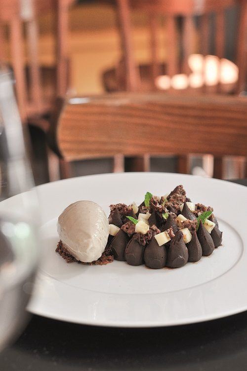 Chocolat kalapaia, compotée de fressinettes, glace aux champignons de Paris et thé lapsang souchong
