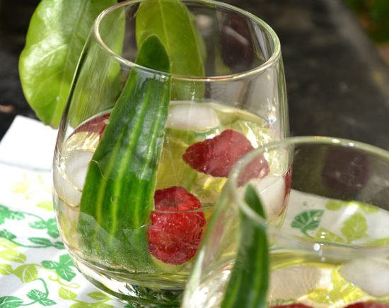 - Verser le sirop de sureau, des glaçons, le vin blanc et les 3 framboises.