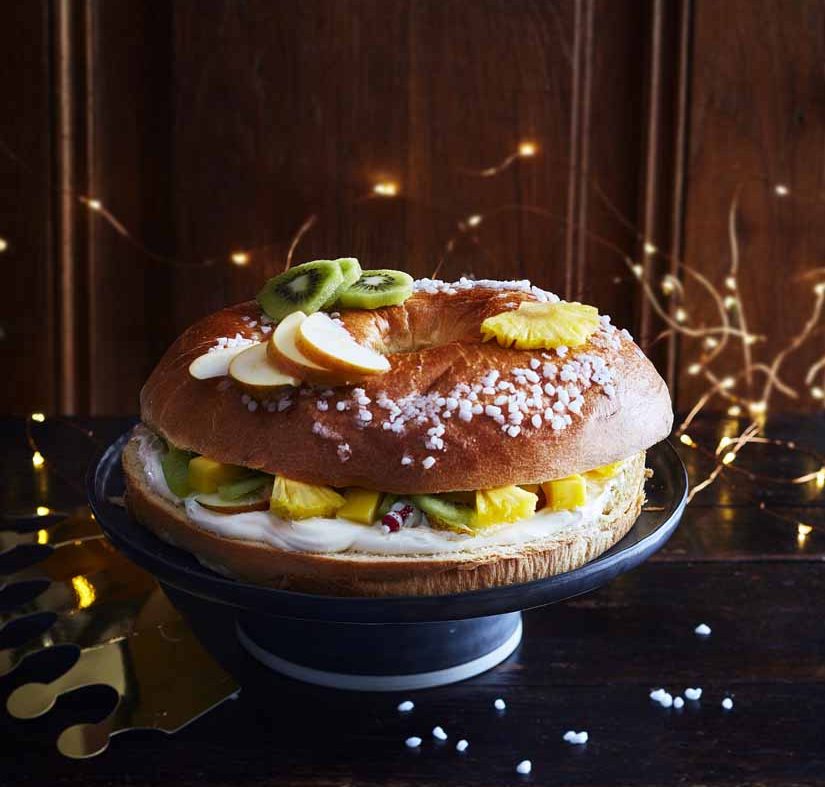 - Tartiner la base de la couronne avec le fromage frais parfumé et garnir de fruits émincés. Refermer la couronne en plaçant la seconde partie de la couronne dessus. *au besoin replacer la fève dans la base de la couronne si elle est tombée au moment de la découpe.