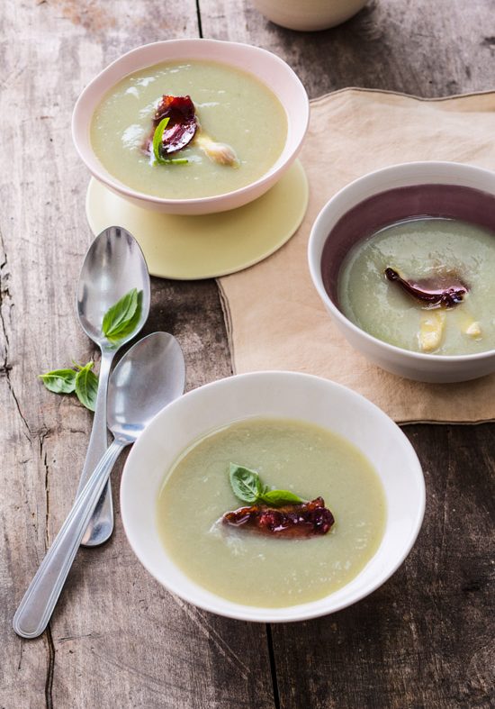 - Servir la crème d'asperge décorée de chips de canard fumé.