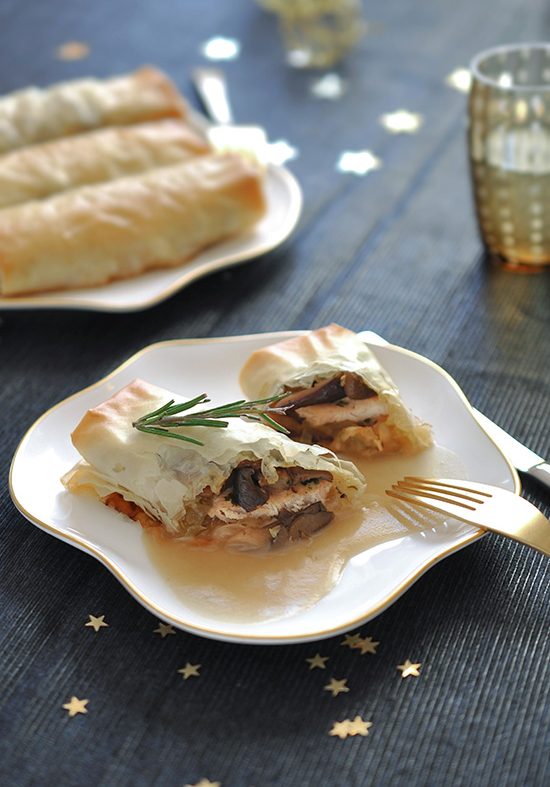 - Placer 1 feuille de pâte filo sur le plan de travail. La plier en deux. Déposer dessus un peu de confit d’oignon, quelques lanières de dinde, des pleurotes sautés et quelques copeaux de truffe. Rouler la pâte autour de ces ingrédients comme un nem.
