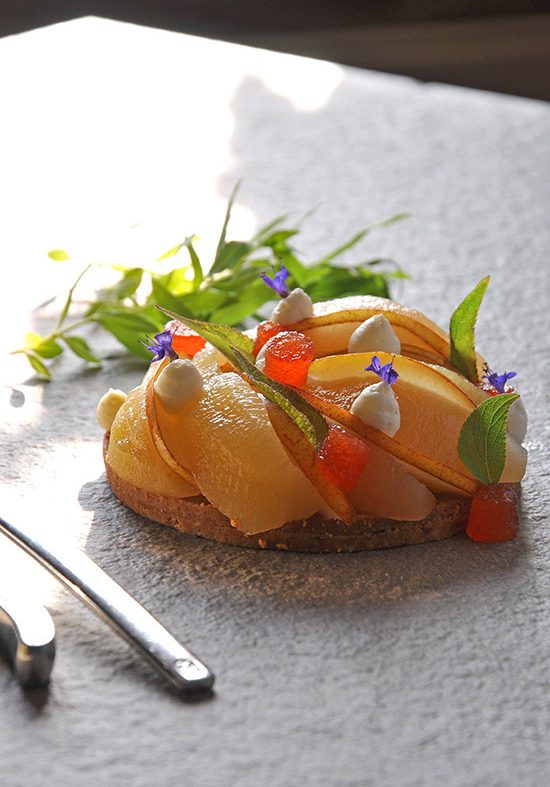 - Décorer avec la crème vanillée, les fleurs de bourrache, les amandes fraîches et la ½ poire crue taillée en fines lamelles biseautées.