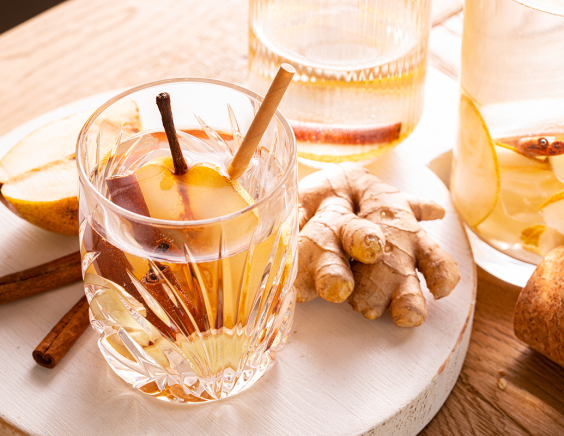 - Terminer avec les feuilles de sauge ananas (ou de verveine fraîche) et quelques gouttes de coulis de poire.