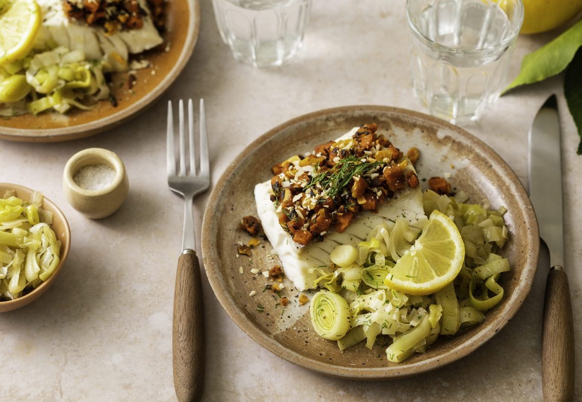 - À la sortie du four, saupoudrer de crumble et servir avec la fondue de poireaux.