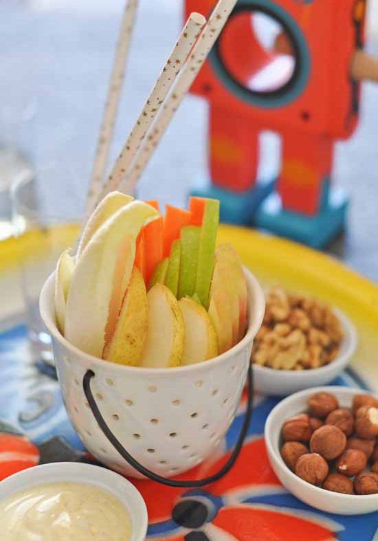 6. Présenter les fruits et légumes dans un bol (pour faire trempette) accompagnés de la sauce et des coupelles de noix et de noisettes.