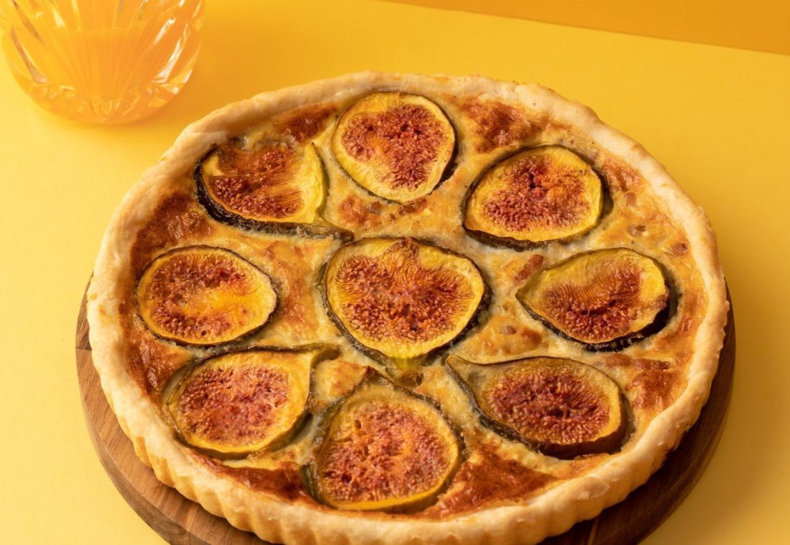 - Répartir les lardons, les rondelles de fromage de chèvre, les courgettes et les figues sur la pâte puis recouvrir avec la préparation aux œufs.