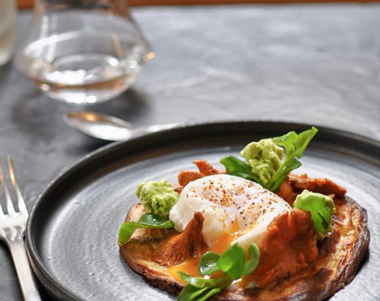 Fine tarte sablée au parmesan, royale à l’aillet, poitrine grillée et roquette