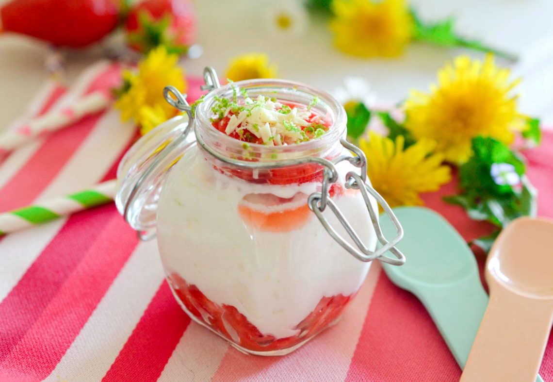 - Disposer quelques dés de fraises dans des petits bocaux en verre. Ajoutez la préparation crémeuse et décorer de fraises entières. Refermer et réserver au frais.