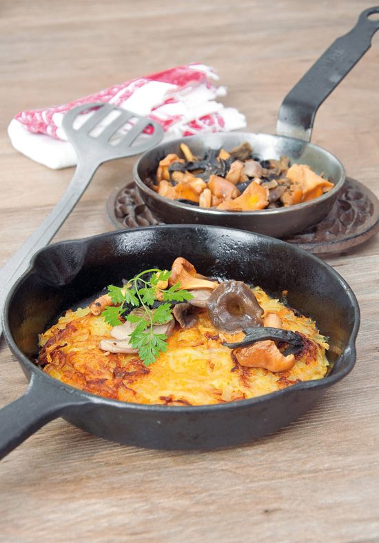 - Déposer la galette de potimarron sur un plat de service puis y répartir les champignons poêlés. Servir bien chaud.