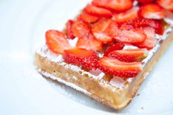 Garnir les gaufres à chaud de fraises marinées au citron vert et poudrer d’un voile de sucre glace. A déguster aussitôt !