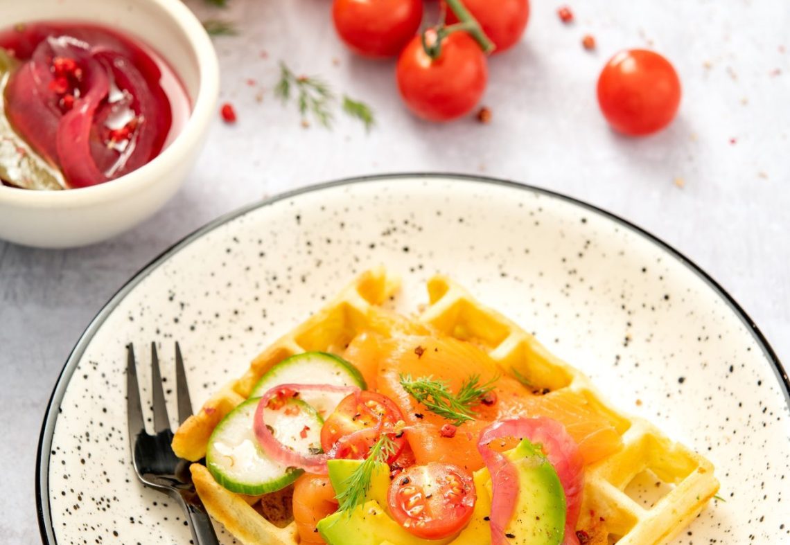 Gaufres de courgette au saumon, avocat, concombre et pickles d’oignon rouge