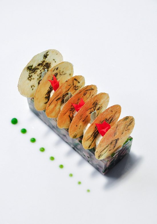 - Démouler la gelée sur assiette. Intercaler dessus cristallines et dômes de fromage (comme un millefeuille vertical). Ajouter des gouttes de jus de livèche centrifugé.