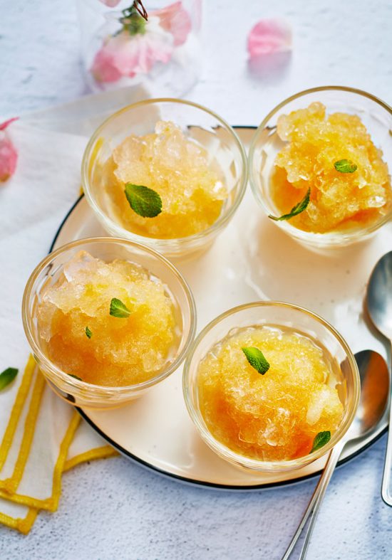 - Servir les granités dans des verrines, ou des coupes bien froides, parsemés de menthe fraîche.