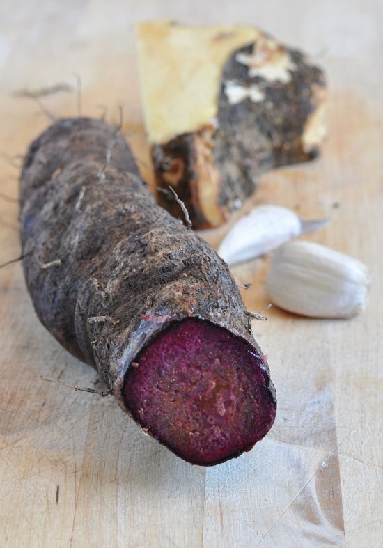 - Peler l’igname et le détailler en cubes (idéalement avec des gants en latex car il peut être pour certaines personnes, urticant). Le cuire à l’eau bouillante salée et parfumée de 2 gousses d’ail et d’une feuille de 4 épices, environ 20 min.