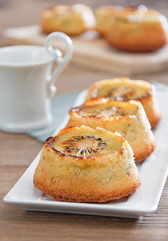 Laisser tiédir avant de démouler les petits moelleux et de les servir retournés (la tranche de kiwi visible).