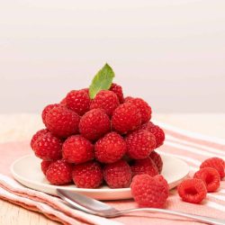 - Déposer une feuille de menthe au sommet de chaque coque de framboise.