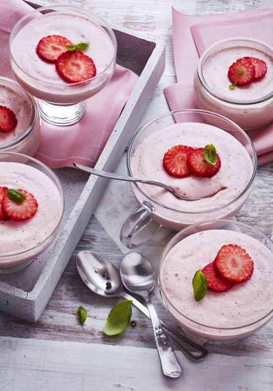 Décorer les mousses de morceaux de fraises et de basilic frais juste avant de servir.